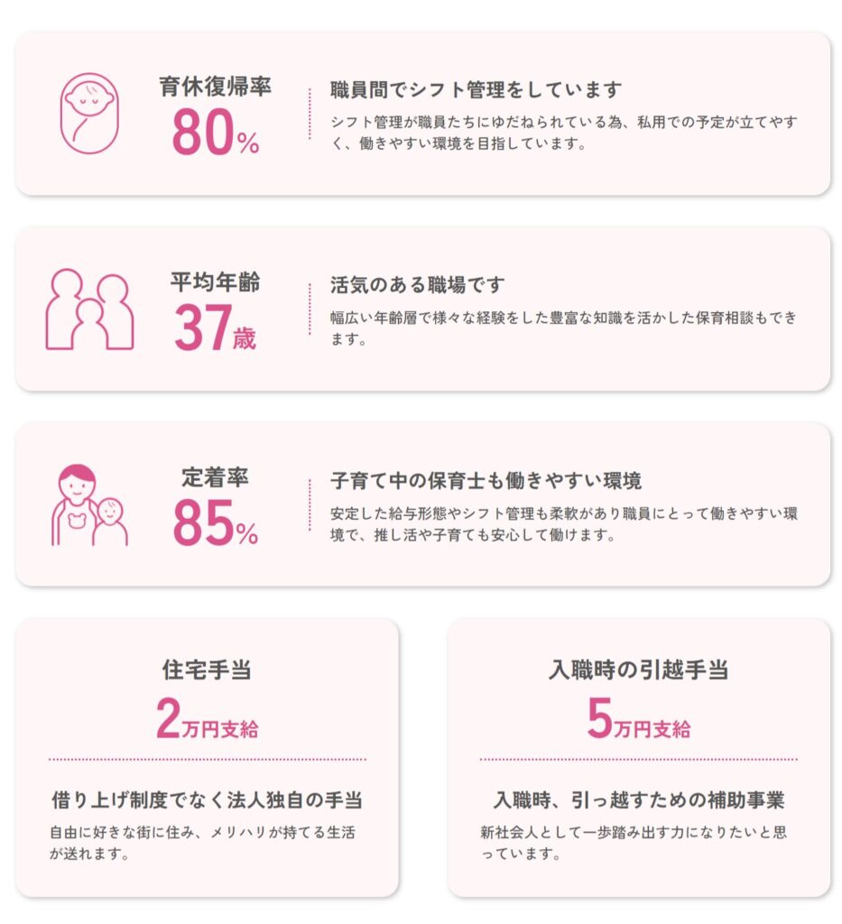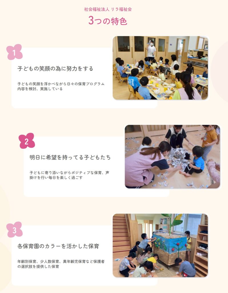 保護者には「安心・安全・信頼」、求職者には「働きやすさ・成長・人間関係の良さ」が響きます。