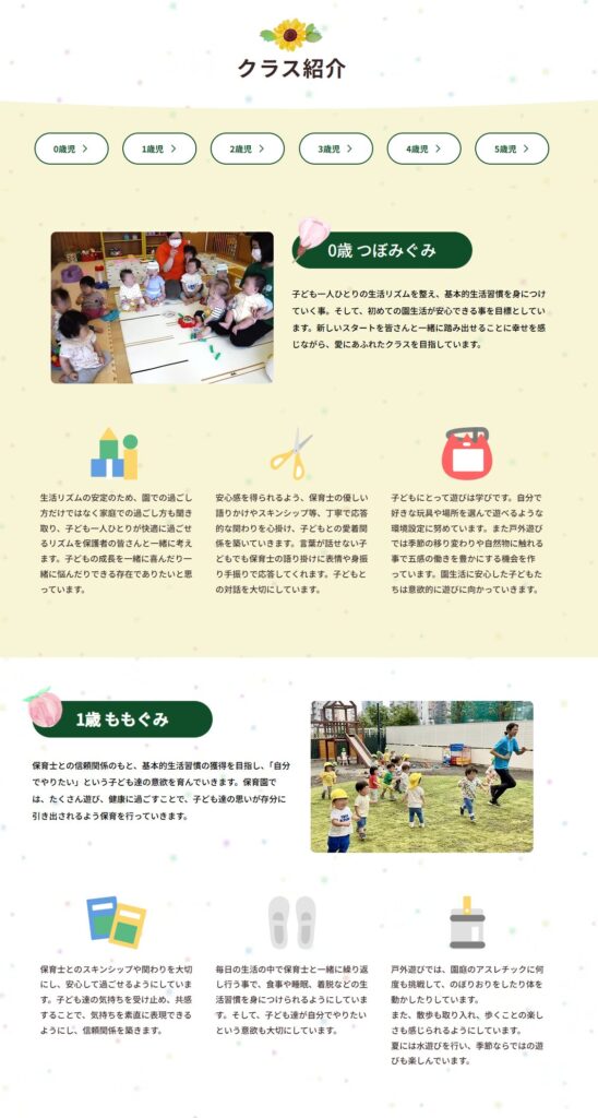 各クラスの保育方針や担当保育士の紹介を掲載し、園全体の雰囲気を伝えましょう。