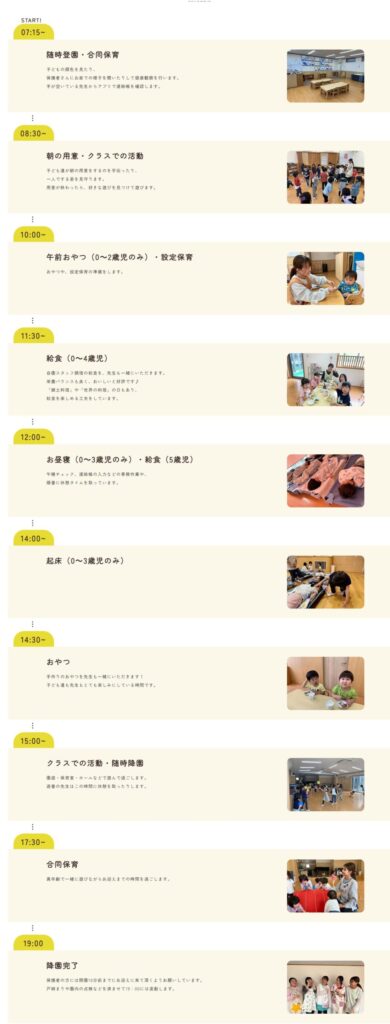 また、「保育園での1日」をタイムライン形式で掲載することで、初めて訪れる求職者、保護者でも一日の流れをイメージしやすくしています。